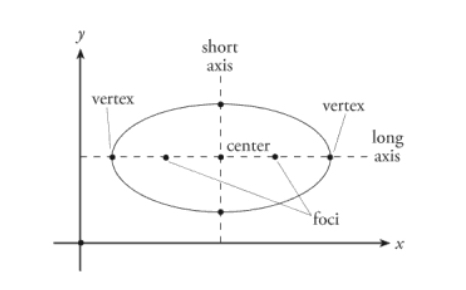 An ellipse has two vertices at the ends of its long axis and two foci points within the ellipse.