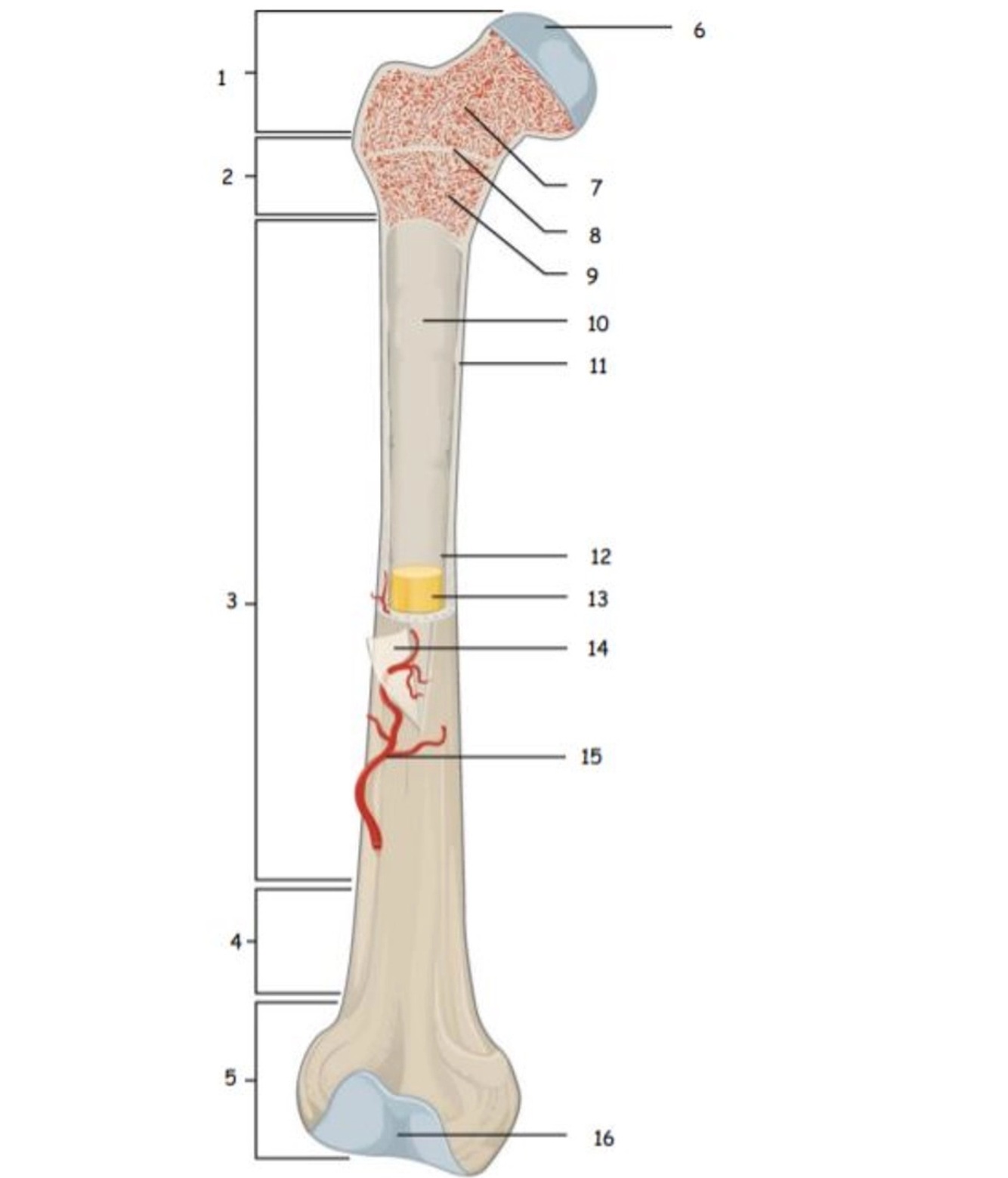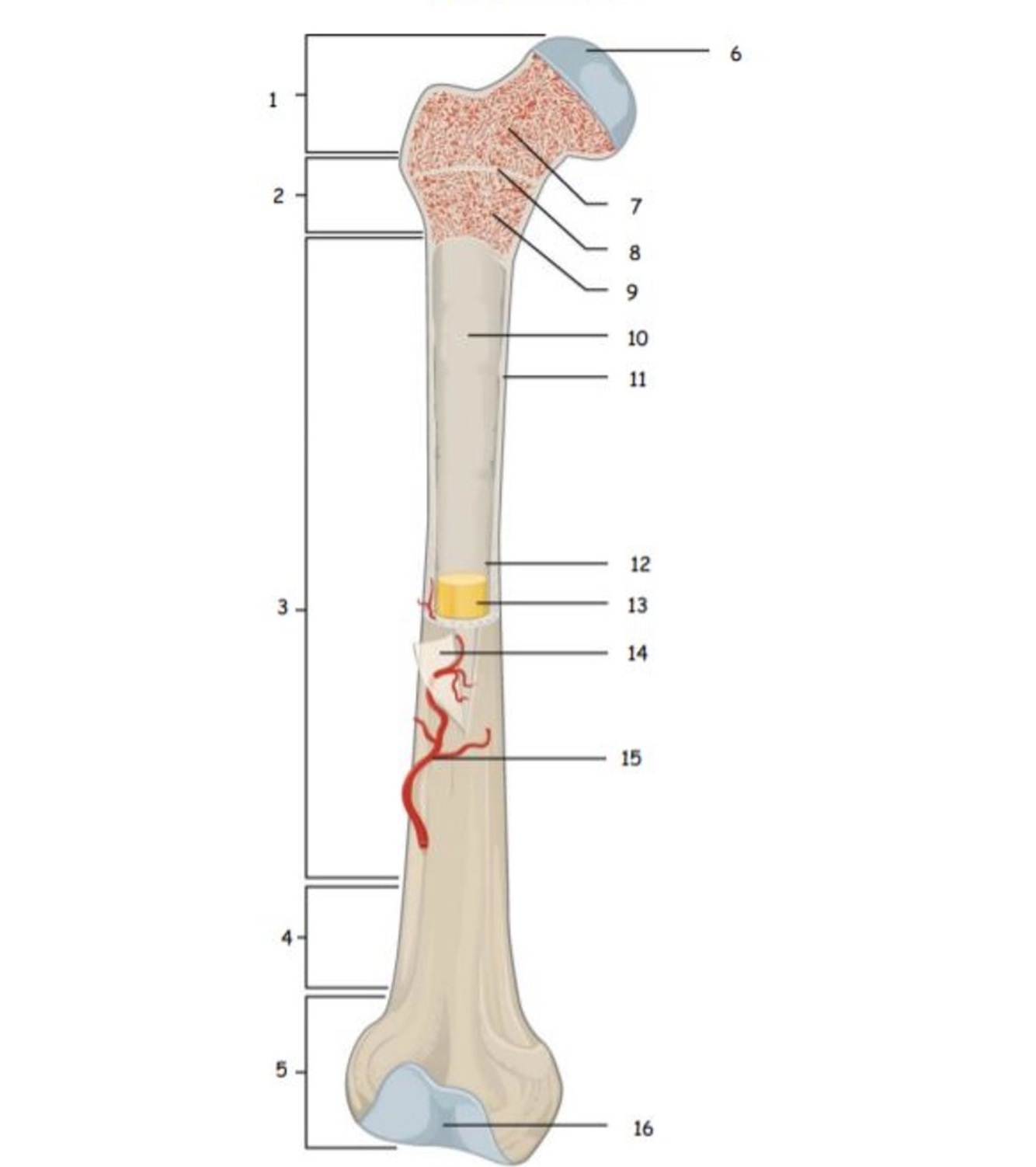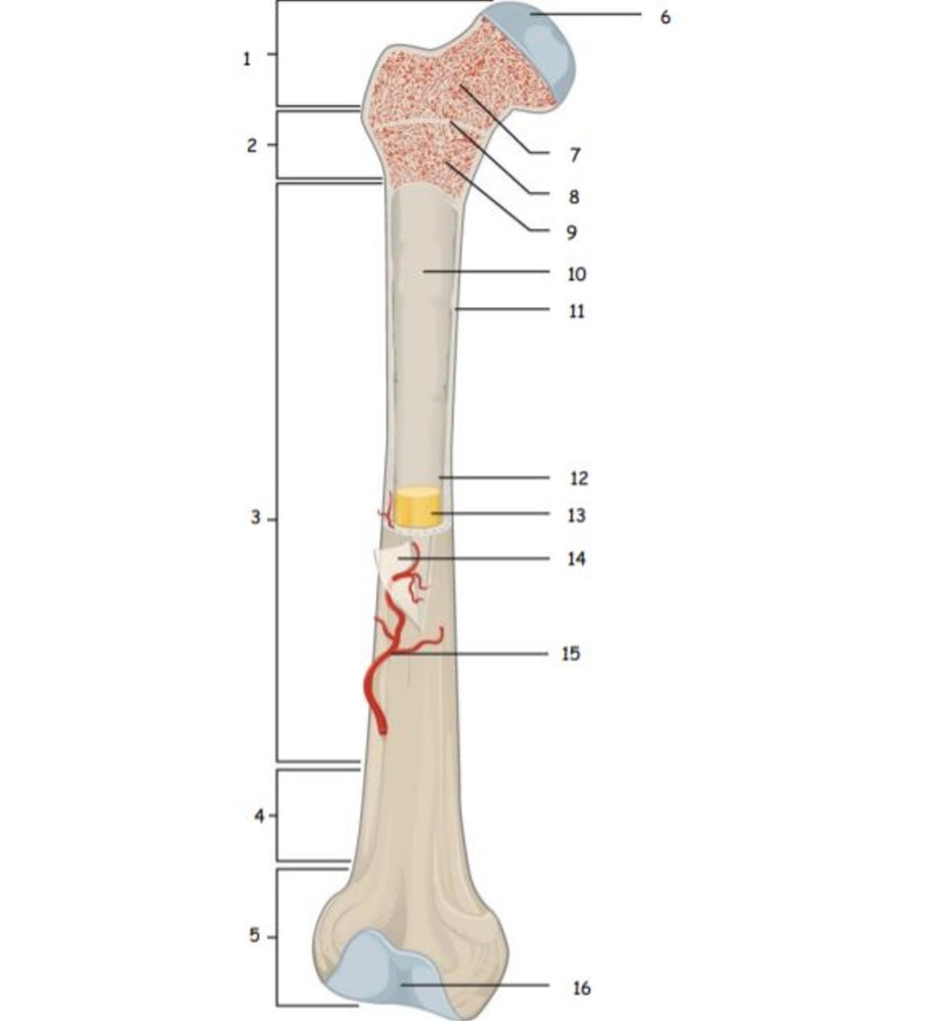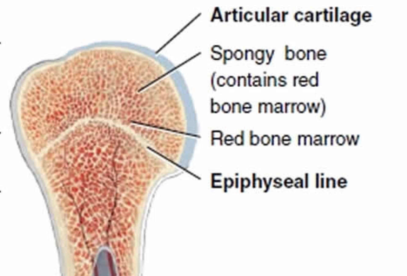 Epiphysis, spongy bone makes up this region. Red bone marrow, produces blood cell (hematopoiesis): create red & white blood cells, platelets