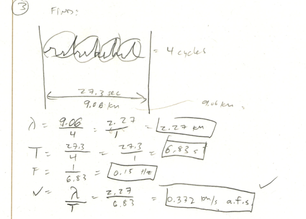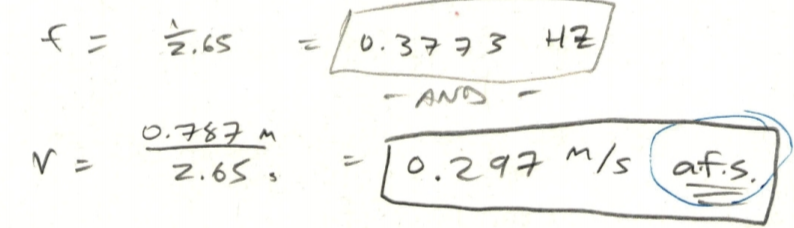 what are the frequency and velocity of a wave where wavelength = 0.787 m and period = 2.65 sec?