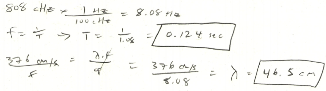what are the wavelength and period of a wave moving at 376 cm/s a.f.s. @ 808 cHz?