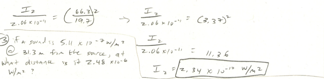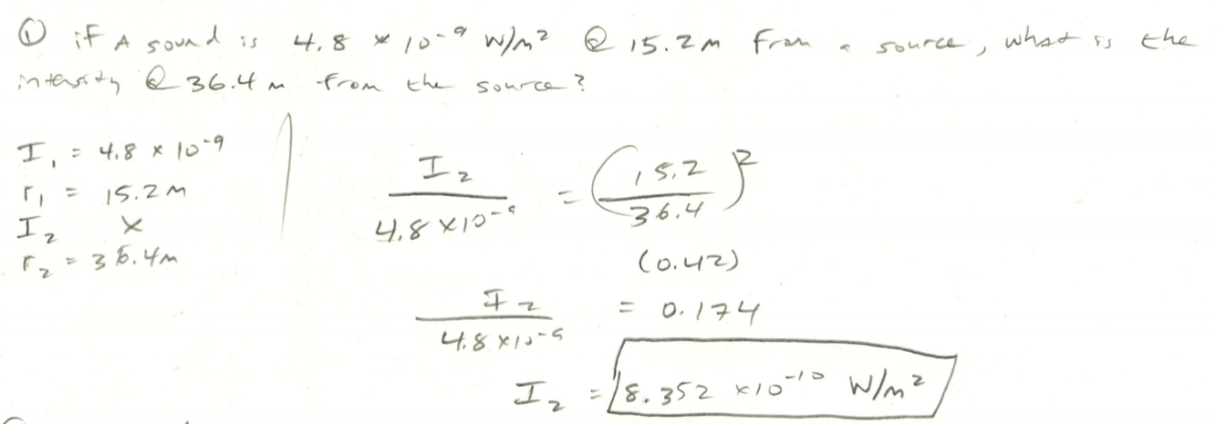 if a sound is 4.8 x 10-9 W/m2 at 15.2 m from a source, what is the intensity at 36.4 m from the source?