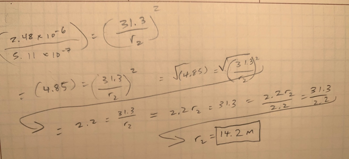 if a sound is 5.11 x 10-7 W/m2 at 31.3 m from the source, at what distance is it 2.48 x 10-6 W/m2 ?