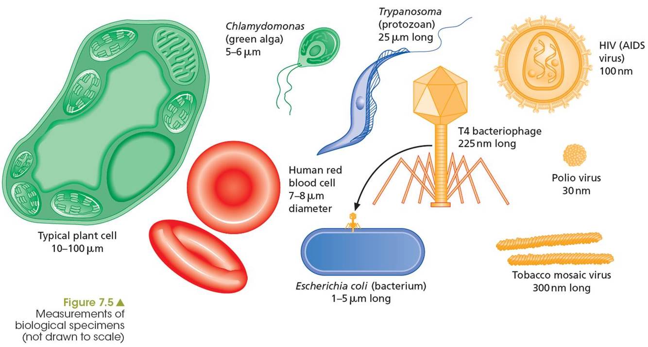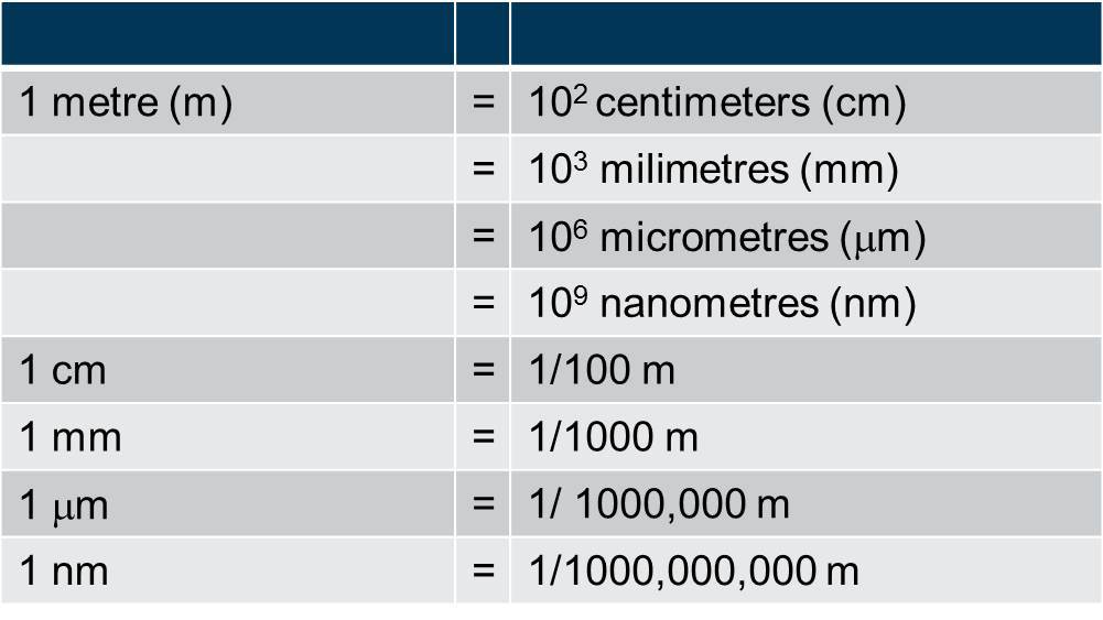 Convert a metre to centimetres, millimetres, micrometres and nanometres. Then express each unit as a fraction of a metre