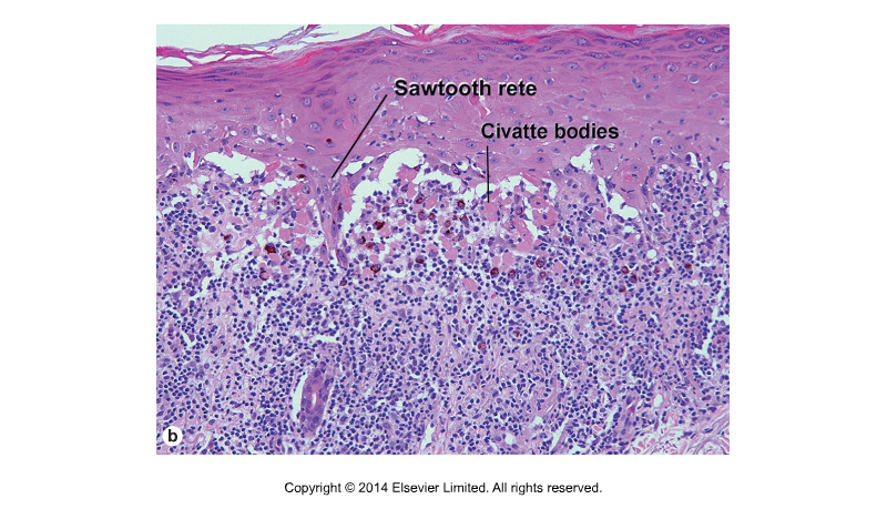 Destruction of basal layer with civatte bodies and sawtooth rete pattern. Hyperkeratosis and hypergranulosis are typically present.