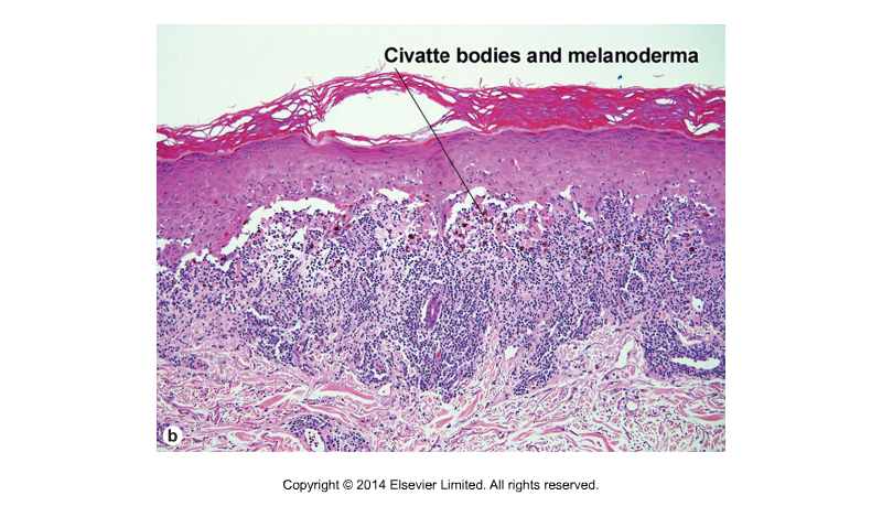 Vacuolar interface dermatitis with a lymphocyte in nearly every vacuole. Keratinocyte necrosis and transepidermal elimination of erythrocytes.