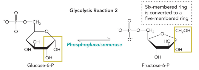 Phosphoglucoisomerase is used to transform Glucose-6-P to Fructose-6-P. The six member ring changes to a five member ring (8)