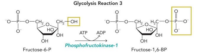 Phosphofructokinase-1 is used to phosphorylate (ATP -> ADP) Fructose-6-P to Fructose-1,6-BP (9)