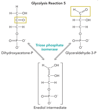 Triose phosphate isomerase makes Dihydroxyacetone-P into an enediol intermediate which can be turned to Glyceraldehyde-3-P (14)