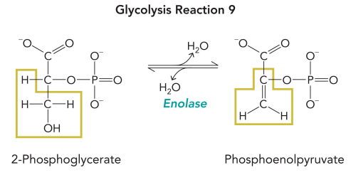 Enolase dehydrates 2-Phosphoglycerate causing it to become Phosphoenolpyruvate