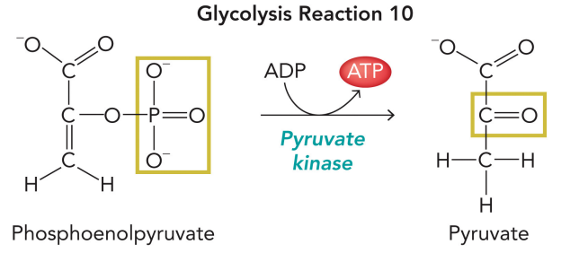 Pyruvate kinase turns Phosphoenolpyruvate into Pyruvate by phosphorylating ADP and turning it to ATP