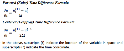 The forward and centered time difference formulae are expressed as: