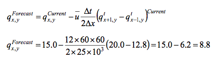 For a grid space of ∆x=25 km, substitute the given values of q at a time t and obtain its forecast value after 1 hour. Consider the speed of the fastest wave in the model grid as 12 m/s.