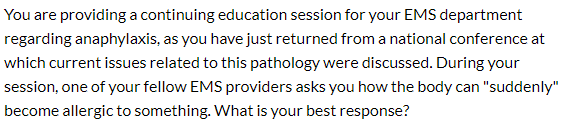 “After exposure to a new antigen, the body will create antibodies to fight it; these antibodies can be the root cause of the anaphylactic response later.”