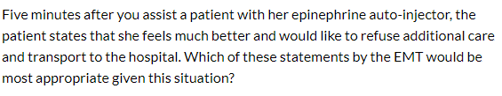 “The epinephrine will start to wear off in 10 or so minutes. Let’s see how you are doing then before thinking about refusing transport.”