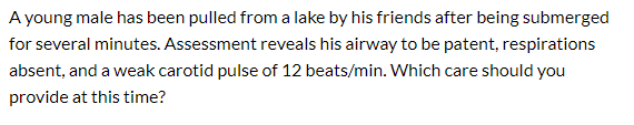 Start positive pressure ventilation, place the patient on a long board, and transport to the hospital