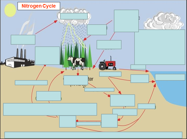 —Nitrogen Fixation: N2 to ammonium by nitrogen-fixing bacteria (prokaryotes in the soil and root nodules), N2 to nitrate by lightning and UV radiation.