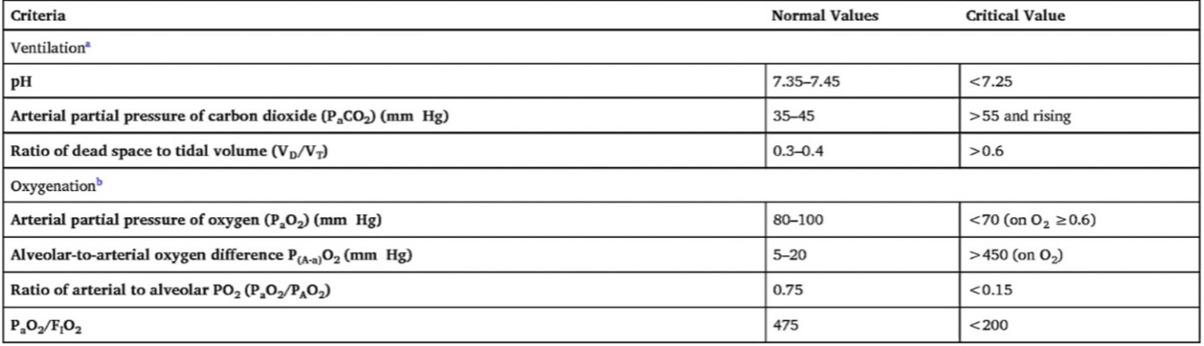 Rate, Vt, PEEP, FiO2, PS, Ti, pressure gradient, PaO2>60, SpO2 >92