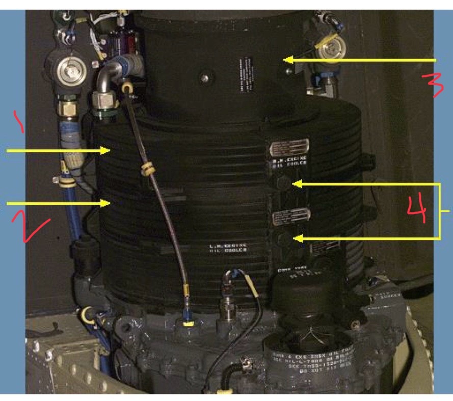 1/2: No 1 and No 2 engine transmission oil cooler. 3: Cooling fan. 4: Oil cooler temp/pressure bypass valve.