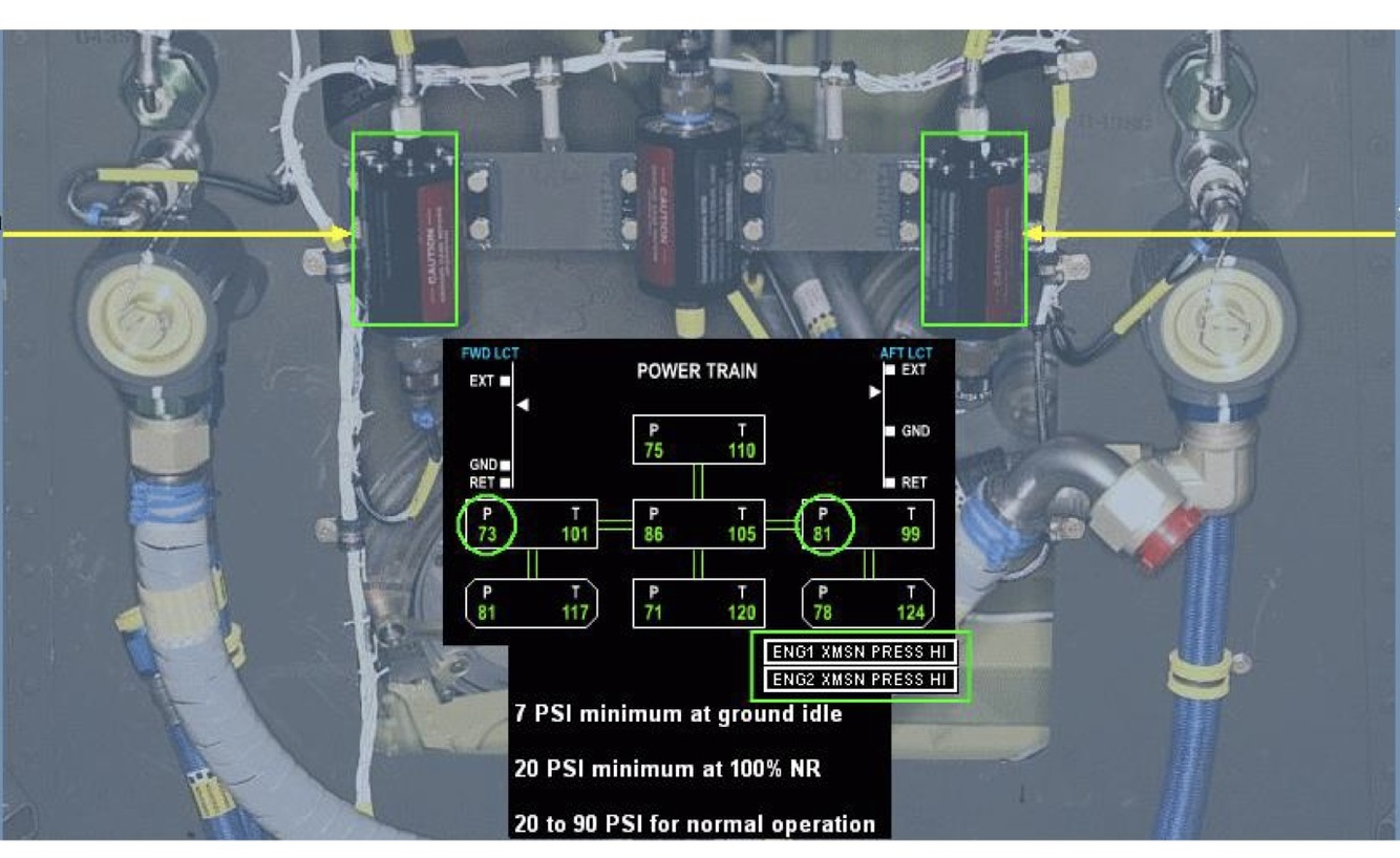 Engine transmission pressure transducer. Normal is equal to or greater than 20. High is greater than 90 PSI.