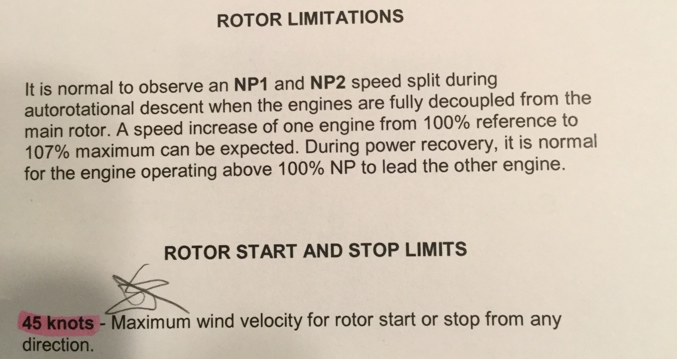 hovering winds greater than 45kts (35with ess) is prohibited. Side/rear flight into wind, when combined with wind speed, shall not exceed 45kts (35kts with ess)