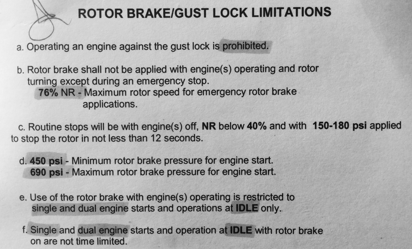 Rotor brake shall not be applied with engin(s)operating and rotor turning except during an emergency stop.