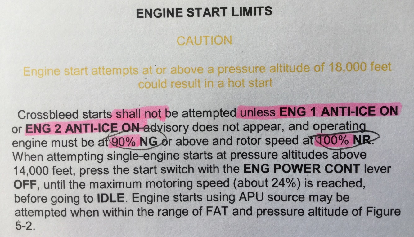 Crossbleed starts ___ ___ be attempted unless _____________ or _______ advisory does not appear, and operating engine must be at__ or above and rotor speed at __?