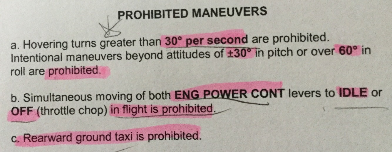Hovering turns greater than _ are prohibited. Intentional maneuvers beyond attitudes of +-_ in pitch or _% in roll are prohibited.