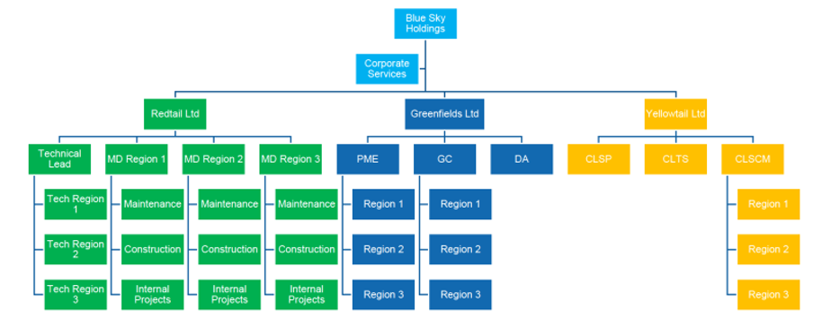 What are the three independent entities of the company (Bluesky holdings)? What is the structure?