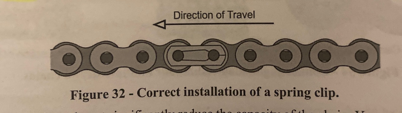 Master links with spring clips must be installed in which direction?