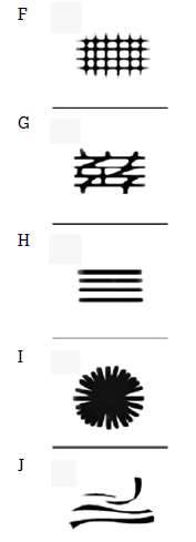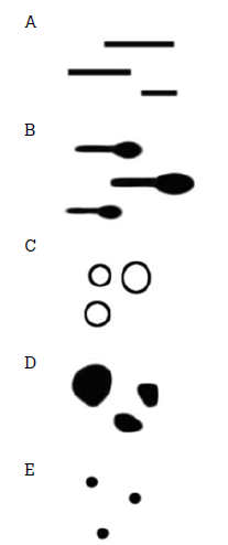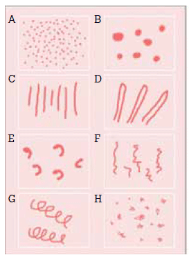 dots (A), clods (B), lines (C), looped (D), curved (E), serpentine (F), helical (G), coiled (H)