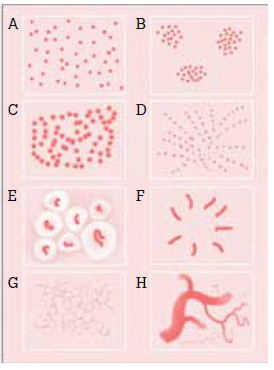random (A), clustered (B), serpiginous (C), linear (D), centred (E), radial (F), reticular (G), branched (H)
