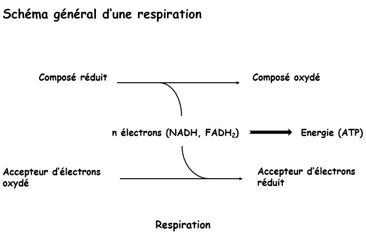 Une réaction de respiration est une oxydation. Elle a pour réactif un composé réduit et un accepteur d’électron oxydé. Par l’intermédiaire de cofacteur tel que la NADH et FADH elle va donner comme produit un composé oxydé et un accepteur d’électron réduit. La réaction de respiration produit de l’ATP.