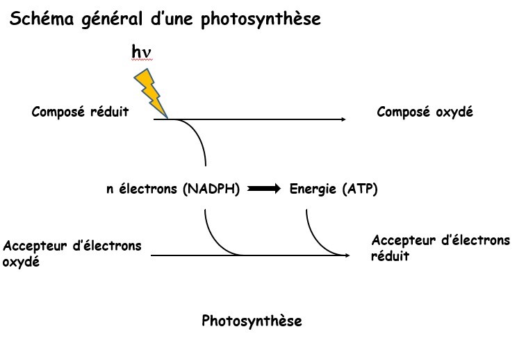 Une réaction de photosynthèse est une oxydation. Elle a pour réactif un composé réduit + l’énergie lumineuse et un accepteur d’électron oxydé. Par l’intermédiaire de cofacteur tel que le NADPH elle va donner comme produit un composé oxydé et un accepteur d’électron réduit. La réaction de photosynthèse produit de l’ATP.
