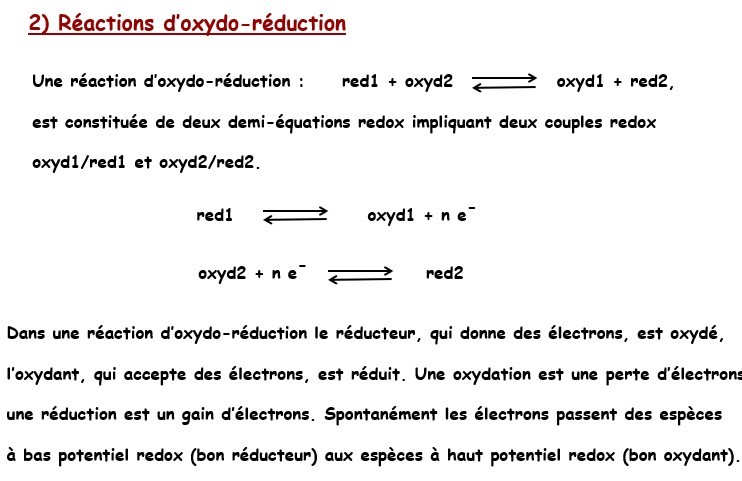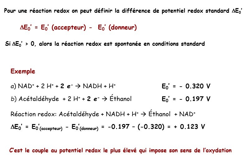 On peut prendre l’exemple de la respiration oxygénique sur sucre qui a pour réactif un composé reduit qui est le glucose et un accepteur d’éléctrons oxydé qui est 1/2 O2 . Par l’intermédiaire de cofacteur tel que le NADH et le FADH elle va donner comme produit un composé oxydé qui est CO2 et un accepteur d’électron qui est l’H20. En générant de l’énergie.