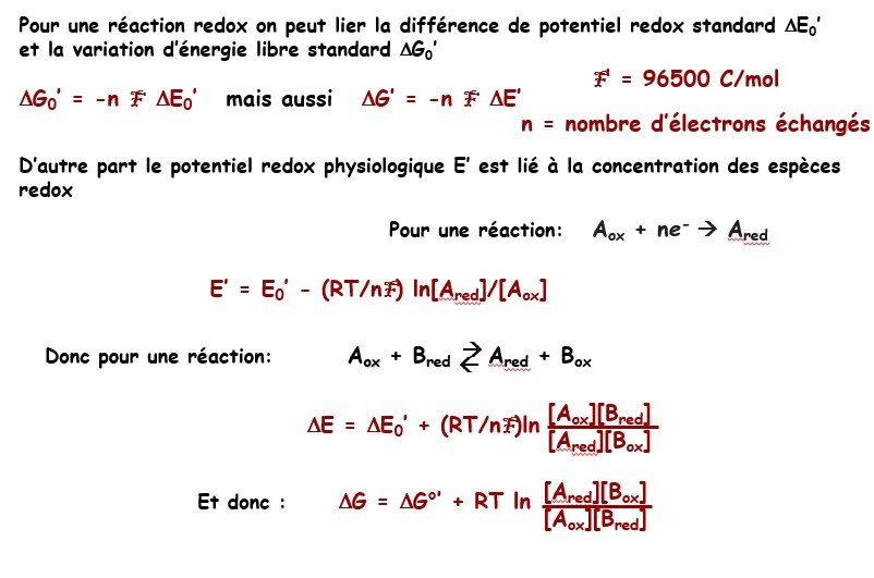 Quelle relation lie la différence de potentiel redox et la variation d’énergie libre ?