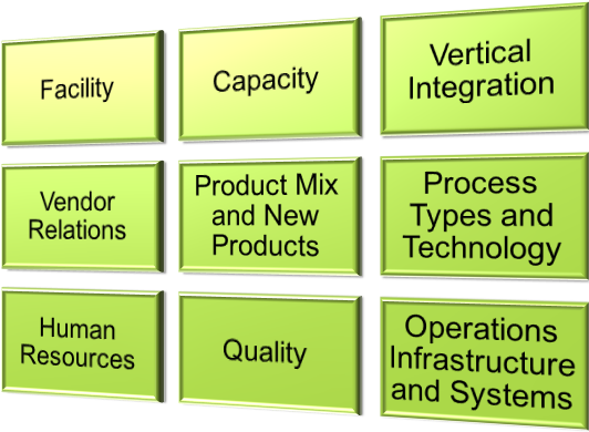 9 strategic (approach that is used to guide the operations function) decision categories