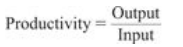 A measure of productive use of resources, usually expressed as the ratio of output to input.