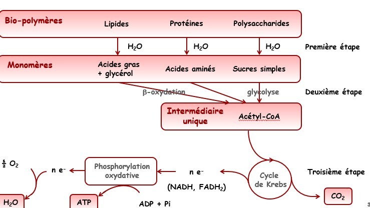 Lors du processus global de respiration l’énergie chimique sous forme de pouvoir réducteur des molécules d’oses, acides gras et aa est transformé en énergie chimique sous forme de pouvoir réducteur dans des molécules NADH , FADH2. Cette énergie est ensuite transformée en une énergie chimique sous forme de liaisons phosphates énergétiques dans la molécules d’ATP.