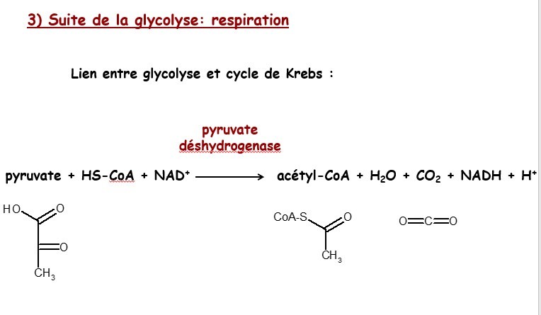 Cette étape permet de faire le lien entre la glycolyse et le cycle de krebs. Pour q’une respiration puisse se mettre en place à la suite de la glycolyse il est nécessaire que la source de carbone passe du cytoplasme de la cellule vers les mitochondries chez les EuK. Ce transfert de pyruvate se fait grâce à une enzyme mitochondriale ( pyruvate désydrogénase) qui transfert le pyruvate en actétyl lié au COA. L’acétyl COA intégrera par la suite le cycle de Krebs.