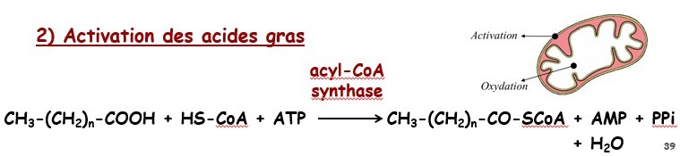 Afin d’être utiliser pour la production d’énergie, les acides gras doivent être activés sous forme d’acétyl coA. Cette réaction se réalise au niveau de la membrane mitochondriale catalysée par l”enzyme AcylCOA synthase. Cette activation coute au final 2 liason phosphates.