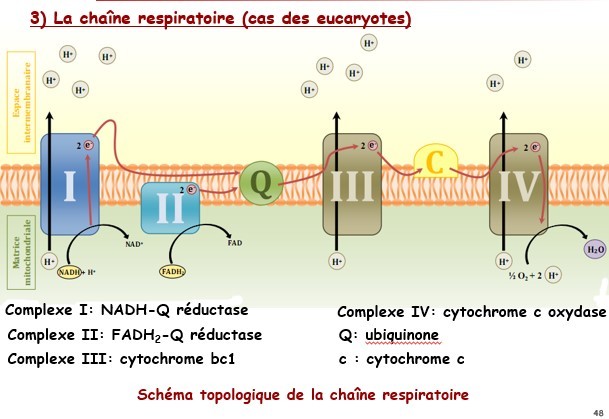 Lorsque les é sont transférer ou éliminer on a production d’énergie. La dernière étape de la respiration consiste à éliminer les électrons obtenus lors de l’oxydation des molécules carbonées en CO2 et stocker le NADH et le FADH2 en les transférant sur un accpeteur final d’électron oxydés (02) avec production de molécules énergétiques (ATP)