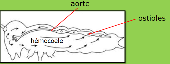Un vaisseau dorsal (aorte) forme une sorte de cœur percé d’ostioles, qui récupère l’hémolymphe(sang) et la redistribue dans l’hémocoele(cavité interne qui contient l’hémolymphe).