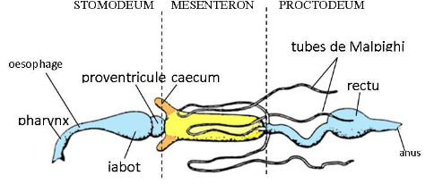 Les déchets de digestion transitent par l’intestin et sont rejetés par l’anus sous formes d’excréments. Les tubes de Malpighibaignent dans l’hémolymphe. Il permettent l’extraction des déchets azotés.