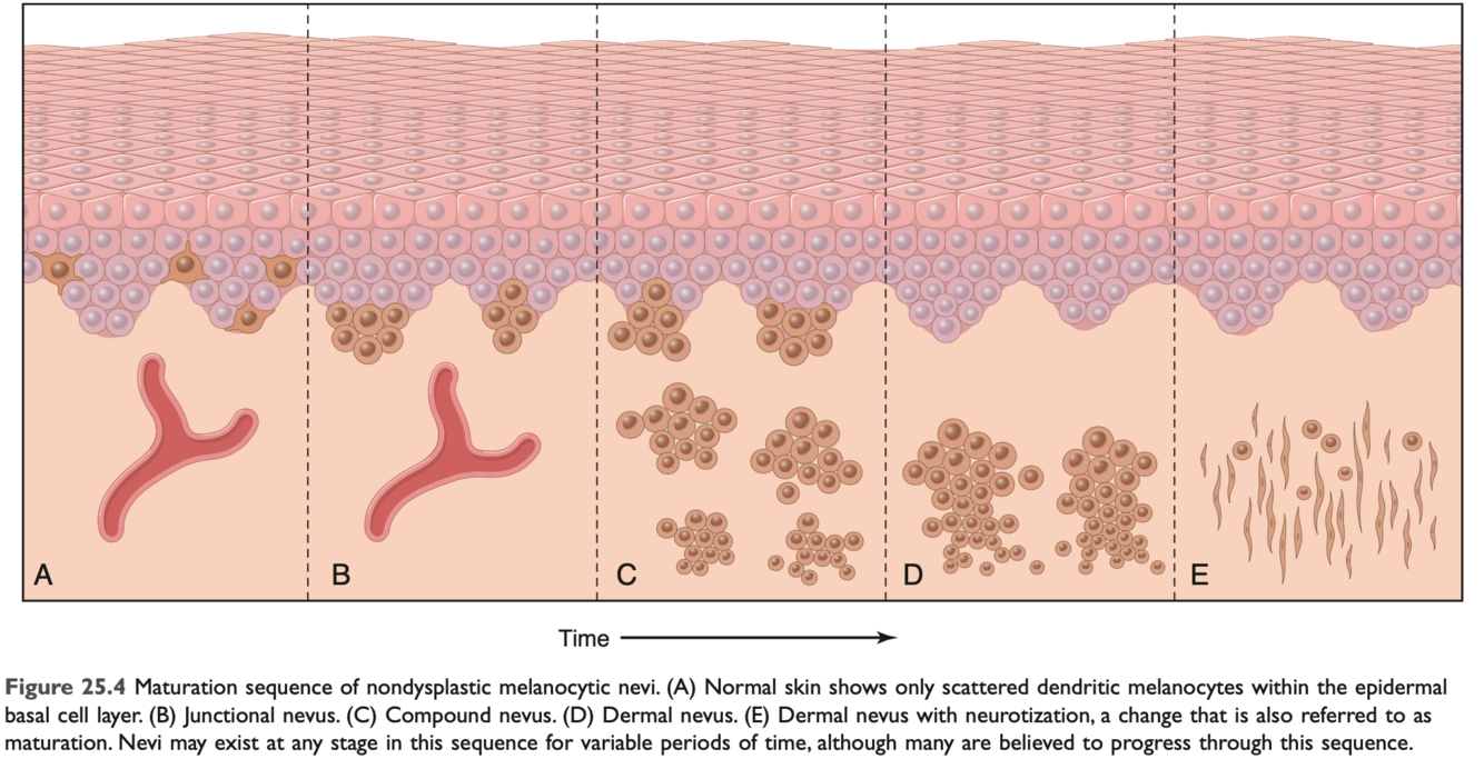 Quels sont les stades d’évolution d’un nevus mélanocytaire commun? (p. 706)