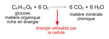C’est la transformation chimique utilisant le glucose et le dioxygène afin de dégager de l’énergie. Elle produit également du dioxyde de carbone et de l’eau.
