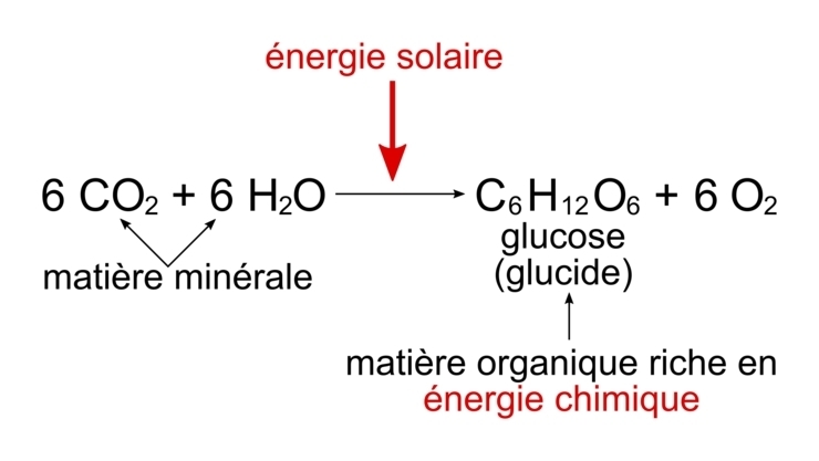 6 CO2(g) + 6 H2O(l) + Énergie → C6H12O6(s) + 6 O2(g)