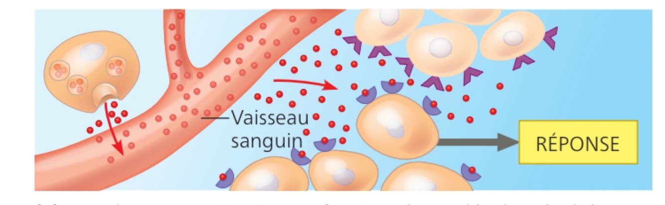 Communication endocrine: des molécules sécrétées diffusent dans la circulation sanguine et déclenchent des réponses dans les cellules cibles de tout le corps.