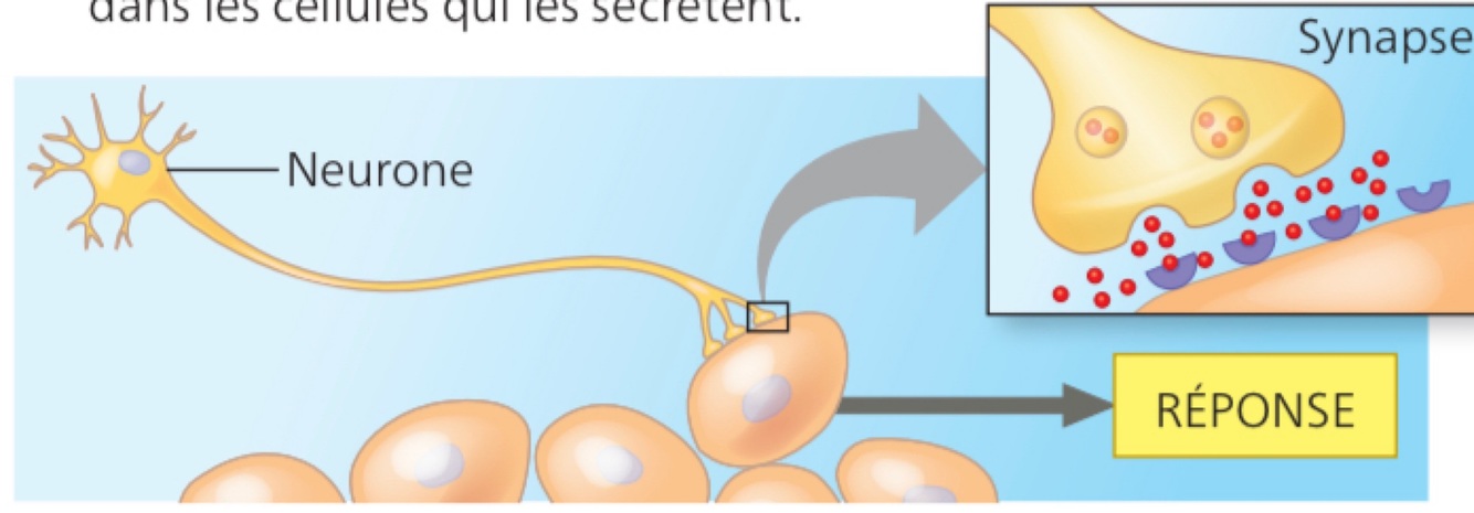 Des neurotransmetteurs diffusent à ttravers les synapses et déclenchent des réponses dans les cellules des tissus cibles (neurones, muscles ou glandes)