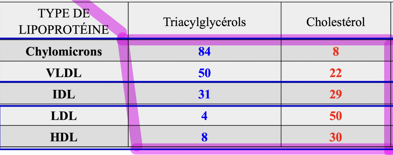 Puisque la masse volumique des TAG est ⬇️ que celle de l’eau, lorsque leur proportion augmente dans la lipoprotéine, la densité de cette dernière ⬇️