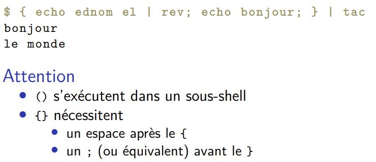 Les accolades « {} » et parenthèses « () » groupent des commandes